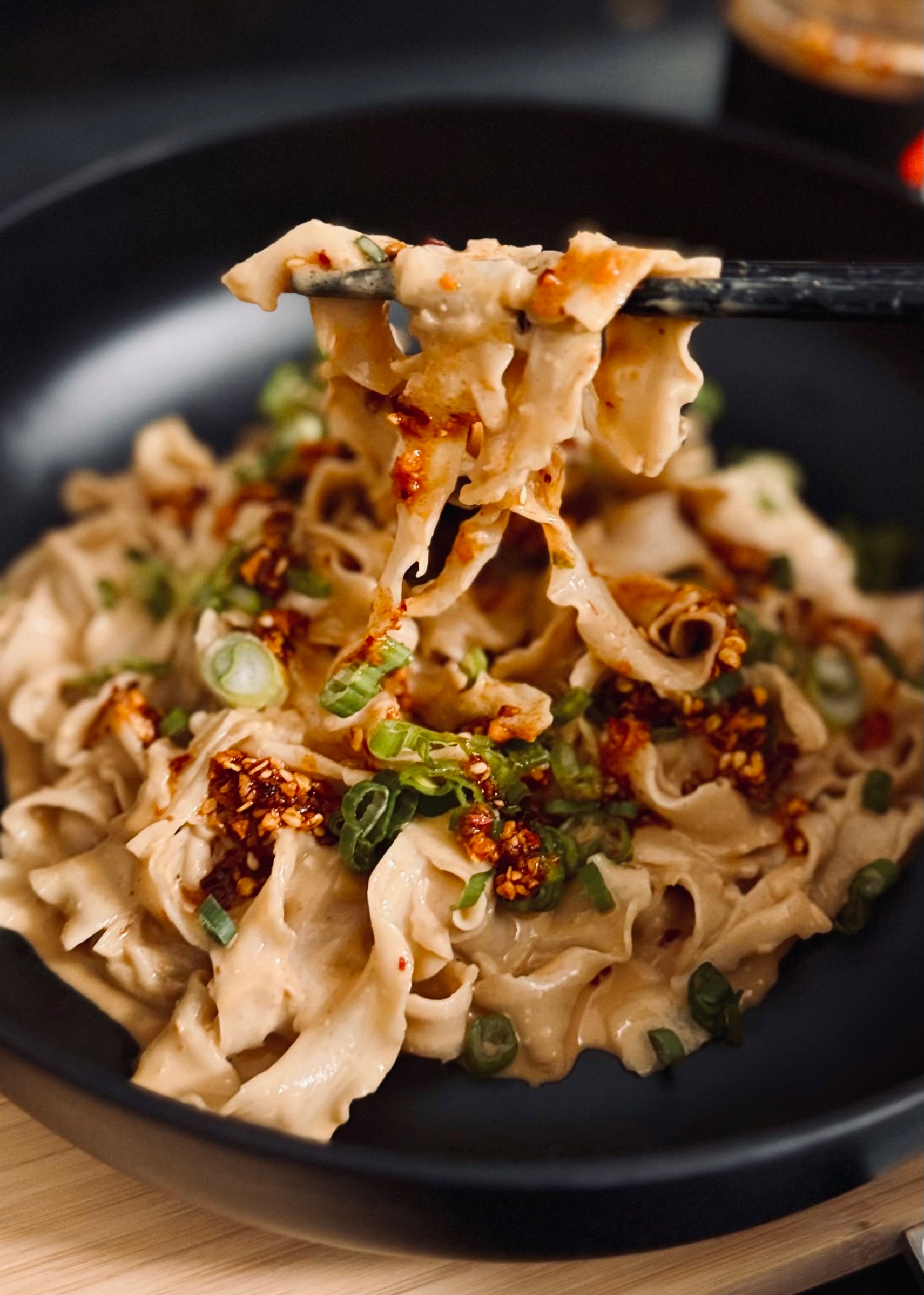 Ingredients: Grapeseed oil, garlic, chili flakes, chili powder, sugar, onion powder, sesame seeds, salt, ginger root, green onions, spices.